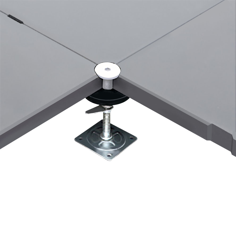 地板四角鍍鋅底座支承,不帶橫梁系統(tǒng)。每塊地板四角有90°圓弧,四塊板組合而成后形成一個圓,有一個鋁制螺母壓角固定。
